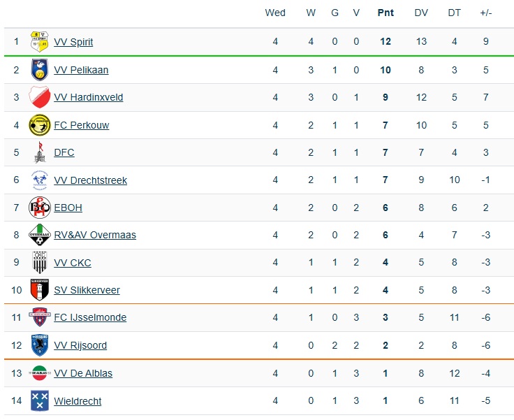 Spirit kent daarentegen een uitstekende competitiestart. Met drie overwinningen op rij voert de ploeg als enige de ranglijst van de 3e klasse H aan.