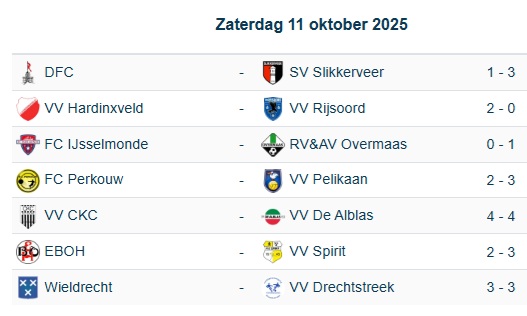 Onderaan de ranglijst speelden Wieldrecht en De Alblas hun eerste gelijkspel van het seizoen. Wieldrecht en Drechtstreek hielden elkaar in evenwicht (3-3), terwijl De Alblas een punt pakte bij CKC (4-4). Beide ploegen bezetten voorlopig nog de onderste plaatsen.